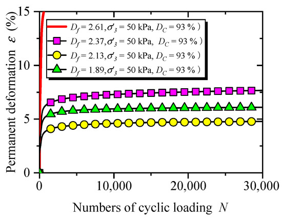 The relationship between and N with different gradings is displayed in Figure 9. As demonstrated in Figure 9: (1) increases approximate linear when N is less than 400. The growth rate of begins to slow down and gradually decreases when . tends to be stable when N is more than 1000. The abovementioned laws apply to the final stability relationship curve between and N. Therefore, N = 1000 can be used as a criterion for reaching the stable stage of CGSF, which can guide the later test loading and coal gangue subgrade engineering. (2) Under the condition of maximum fine particle content ( = 2.61), the coal gangue sample will fail ( reaches 15%) rapidly when N is very small (N = 535). Moreover, in these four groups of tests, of the coal gangue sample is the smallest when = 2.13. Hence, the influence of grading, i.e., particle size distribution, on of coal gangue samples is significant. With the increase of the fractal dimension (), first decreases and then increases, reflecting that there is an obvious optimal grading for coal gangue samples under cyclic loading. Wu et al. [26,38] studied the compaction characteristics of coarse aggregates for embankment dams using the surface vibration compaction test and lateral compression test, which showed that there is an optimal grading of coarse aggregate. In addition, through the large-scale vibration compaction test and static shear test, the authors of [39] also investigated the influence of grading on the compaction and strength of CGSF, and then the optimal grading, i.e., , was captured using FMGE. The reason for this phenomenon is related to the contact relationship and interlocking relationship between coarse and fine particles. These conclusions are all consistent with this study.
