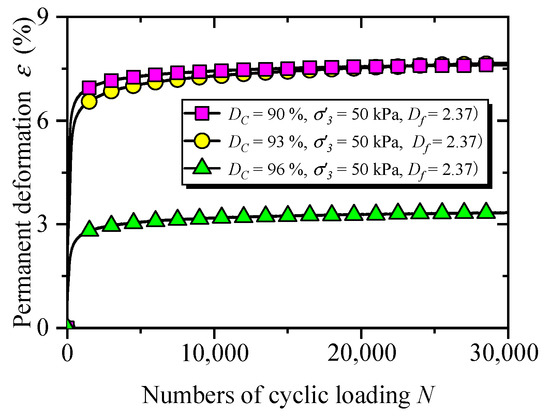 The evolution of versus N with different compaction degree values is displayed in Figure 10. As demonstrated in Figure 10: (1) The relationship between and N with different compaction degree values is consistent with the variation laws under different confining pressures and grading parameters. (2) When the compaction degree increases from 90% to 93%, the development of is hardly affected. However, when the compaction degree increases from 93% to 96%, increasing compaction degree has a significant effect on restraining . Therefore, the effect of compaction degree on of CGSF depends on the level of compaction degree. is hardly affected when the compaction degree is smaller, whereas increasing the compaction degree has a significant effect on restraining when the compaction degree is bigger.
