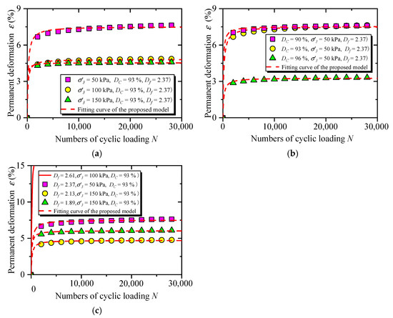 The test data of Figure 8a in Li et al. [35], Figure 3 in Wang et al. [37], and Figure 3a in Mei et al. [43] were selected to verify the correctness of the unified model of permanent deformation in this paper. Figure 14a–c display the fitting effect of the test data in the above research and the permanent deformation model established in this paper. It can be seen from Figure 14 that the permanent deformation model established in this paper can describe the permanent deformation test results in the existing research well, thus verifying the correctness of this model. In addition, three types of the permanent deformation curve in Figure 14 can be described well by the unified model of permanent deformation in this study, which shows the universal applicability of the model in this paper.