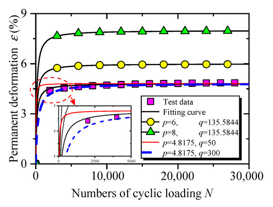 It can be seen from Figure 13 that, when q is constant, the N required before the permanent deformation curve tends to be stable is basically unchanged with the increase of p, whereas the stable value of the permanent deformation curve increases accordingly. Therefore, p reflects the permanent deformation in the stable stage. The greater p occurs with the bigger permanent deformation. Similarly, when p is constant, with the increasing q, the permanent deformation at the stable stage remains unchanged, whereas the N required before the curve tends to be stable increases. Hence, q indicates the N required before the permanent deformation curve tends to be stable, and the greater N required before the permanent deformation curve reaches the stable stage occurs with a larger q.