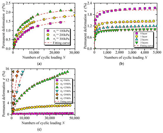 where indicates the permanent deformation, N represents the numbers of cyclic loading, and and are the fitting parameters of this model.