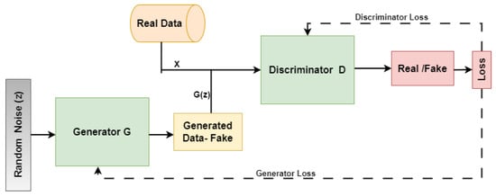 Numerous research studies, including Refs. [19,20,21,22,23], have been conducted since the GAN framework was first introduced in 2014 by Goodfellow et al. [4], which consists of two neural networks (NN) models, typically, a generator G and a discriminator D. GANs have gained a lot of attention among deep learning (DL) researchers, but the majority of the experiments were concerned with the creation of images such as creating anime characters [19], creating photos of people’s faces [20], image in-painting [21], creating bedroom images [22], and removing noise (rain) from images [23]. Their success is partly due to their capacity for producing and modifying data across several fields. While computer vision (CV) has been the primary use for GANs up to this point, they have also been successfully used in other contexts, such as natural language processing (NLP). GANs have recently shown that they are capable of generating high-quality images and videos as well as style transfer and image completeness [20,22,23]. Additionally, they have been utilized with effectiveness for imputation, sequence predicting, and audio generation as shown in Figure 1.
