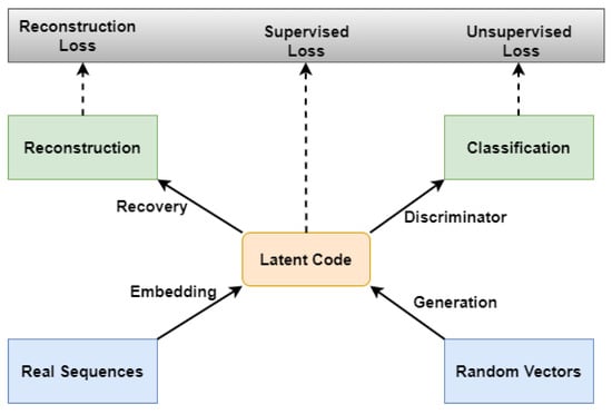 where is loss of reconstruction, is unsupervised loss, is supervised loss and p is the true distribution. Through back-propagation, the weights of the recovery and embedding functions are updated using the reconstruction loss , is the distribution of the model, x represents the real data, is the data after reconstruction, and T is the timestamp.