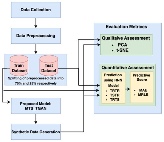 Unfortunately, there is no set consensus on the metrics for evaluating the generated data for time-series GANs because of the small number of research studies that have been published [9,10,11,12]. Different strategies [13,14] have been put out, but as of now, none has emerged as the leader in the metrics field. Hence, we, in this research, have aimed at improving the time-series (TS) data’s multivariate factor by implementing our proposed model named MTS-TGAN, which is an extension of TimeGAN [8]. The novelty of the paper is designing, implementing, and evaluating (both qualitatively and quantitatively) the model which can generate multivariate time-series data with better evaluation scores. The further novelty of our proposed model (MTS-TGAN) includes the inception of a pre-processing layer, namely, a feature selector which outputs the important features that help in removing extra noise, which hinders the synthetic generation of data, as well as hyper-parameter tuning, such as having a number of GRU layers [15], such as six (for all four modules, namely generator (G), discriminator (D), embedding (E) and recovery (R) functions) [8] and using the activation function ReLU [16] and implementing the proposed model on two datasets, such as a Google stock [17] and UniMiB human activity recognition (HAR) dataset [18] to show that the model is efficient in working with the multivariate TS data.