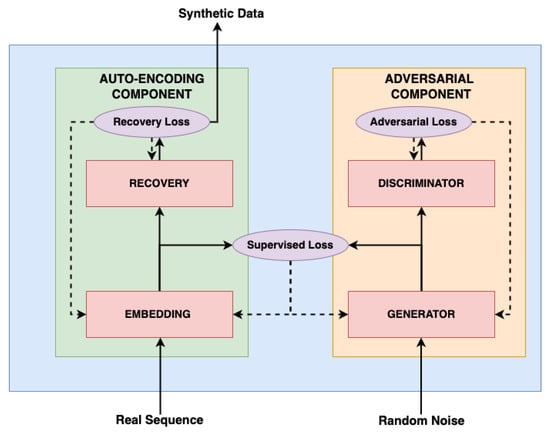 The sequence discriminator and generator as well as the recovery and embedding function are the four sub-components that makeup MTS-TGAN. The major finding is that the auto-encoding and adversarial components are trained together so that the proposed model simultaneously learns to encode features, generate sequences and iterate over time. The adversarial network acts in the latent space that the embedding network supplies and a supervised loss synchronize the latent dynamics of both real and synthetic data. Each sub-component is individually described in Figure 5.