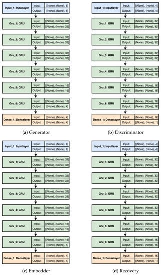 The decision to use GRU layers in the proposed model is given to recurrent neural networks (RNNs) [37], which are appropriate for TS data [8,25,26] as analyzed from related works in Section 2. Six stacked GRUs [15], each with 32 units, were used to construct the generator, discriminator, embedder, and recovery function networks in the proposed model. It is possible for a network to learn deeper and more complicated patterns by using stacked GRUs, which is unquestionably the case with six signals, respectively, with various features. Trial and error led to the decision to use six layered GRUs with 32 units on one, two, and three GRU layers followed by 16 units on four, five and six layers.