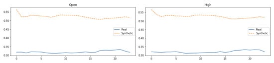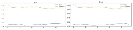 The predictive and discriminator scores show the MAE values in relation to the generated data sequence and the original data sequence, respectively, as shown in Table 5. However, the predictive and discriminative scores acquired, 0.024 and 0.092, respectively, are still significantly more accurate than the outcomes of the initial implementation [8] by 13% and 10%, respectively, as shown in Table 5.