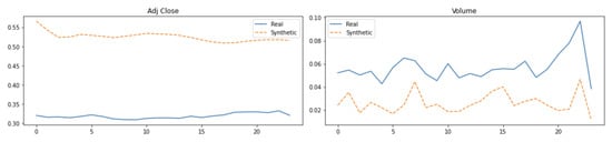After implementing the proposed model, we found that the MTS-TGAN can simultaneously learn to produce representations, encode characteristics and iterate across time. We further compared MTS-TGAN to Time-GAN [8], the best available alternative, and assessed it using qualitative visualizations and quantitative metrics. Graphs of the columns Low, High, Close, Open, Adj Close and Volume of the Google dataset [17] and columns Running and Jumping of the UniMIB dataset [18] are plotted to show the visual representation of the real and the synthetic data. Some generated samples are shown in Figure 6, Figure 7, Figure 8, Figure 9, Figure 10, Figure 11 and Figure 12. Real and synthetic data both continue to be standardized with values between [0, 1] for the Google dataset [17].