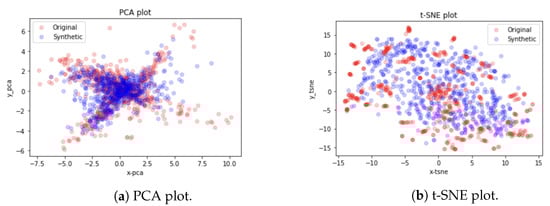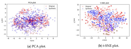 Figure 13, Figure 14 and Figure 15 show visualization example graphs of data point distributions transferred to two dimensions using PCA and t-SNE, which further highlights the resemblance between the real data and synthetic data. These charts show red dots for the original data and blue dots for MTS-TGAN-generated synthetic data. Once more, we see a resemblance in the distribution patterns of the real and synthetic data.