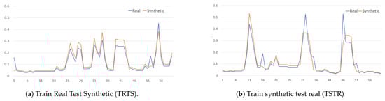 Table 6 displays the regression score of the MTS-TGAN model. The RNN model performs the prediction for both the MAE and MSLE scores more accurately when the scores are close to zero. The TRTS scores are higher than the TRTR values, as expected, indicating that the RNN model performs better on real data than on synthetic data. The scores for TRTR and TRTS in the model are very close to zero, indicating excellent prediction, and the discrepancies between these scores are minimal as shown in Figure 16. The TSTR scores are much higher than the scores of TRTS in terms of both MSLE and MAE for a sequence length of 60 s and iterations.