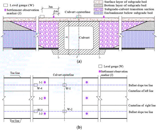 The culvert transition section and the surface layer on the foundation bed of the existing line and the new line were filled with respective layers of 3% cement-graded crushed stone and 5% cement-graded crushed stone (0.6 m) (shown in Figure 2). The length × width × height of the principal culvert part at Site 1 was 15.75 m × 6.0 m × 6.0 m. The extension on the uplink side was 7 m, and the extension on the downlink side was 9 m. The length × width × height of the principal culvert part at Site 2 was 15.0 m × 4.0 m × 4.0 m. The extension on the uplink and downlink sides was 13 m. In the operation stage of the existing line, a monitoring section was set at a distance of 1m from the culvert structures and the settlement observation markers were used for monitoring the settlement of line center and the road shoulder.(shown in Figure 2). A level gauge was also set longitudinally at the transition section of the existing line and at the toe of the ballast slope at the top of the culvert before the construction of the new subgrade.