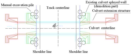 When a culvert extension structure is constructed in the widening section of a railway, the existing line culvert structure and the transition section will experience a certain level of post-construction settlement during the filling and service stages [,,]. Scholars have considered novel materials and structures in their research to reduce the impact on existing lines during the construction of newly built structures. According to an actual roadbed width project, Sun [,] analyzed the weak point of the culvert extension, using reinforcing steel on the culvert tops and walls and geofoam and foam concrete to reduce loads on the culvert. Li [] used a combination of manual excavation piles and H-shaped sheet piles to protect the existing subgrade before the construction of a high-fill culvert extension, which ensured that the settlement of the existing subgrade was within a reasonable range. Zuo [] proposed the lengthening culvert types of the frame culvert and board culvert, and employed a prefabricated jacking construction scheme, for added second-line railway projects by Han-Chang and Han-Ji railways in order to ensure the construction safety of culverts on existing lines. Lian [] combined a steel sheet pile and cross-bracing protection construction program for a speed-increasing reconstruction project in the eastern section of the Hainan Island Ring Railway. Chen [] proposed a lateral jacking frame culvert scheme that was based on the actual difficulties of skew slab culvert lengthening construction of an existing railway line combined with actual engineering. Loess as a special soil, the soil structure is prone to produce significant deformation under the effect of additional stress or increased moisture []. It is one of the technical difficulties to carry out culvert extension project in the loess area but also the control projects in railway construction engineering. The impact of new railway engineering on existing lines in loess regions and the required control reduction measures are unclear due to a lack of research in this area. To address this, we first analyze the technical difficulties of the culvert extension scheme based on a culvert extension project in a loess region. The optimized control reduction measures are then determined based on the protection and structure construction schemes. The deformation data of the transition section of the existing line and culvert during the construction phase of the culvert extension and its transition section filling are monitored. The suitability of the reduction and control measures of the culvert extension and the impact of each phase of construction on the existing line is then analyzed.