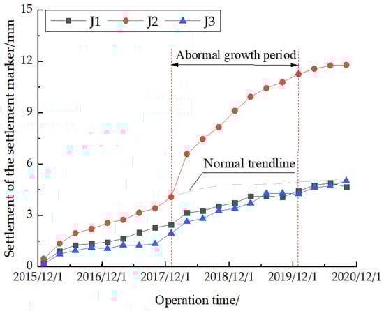 As shown in Figure 5, Site 2 displays the phenomenon of mortar rubble damage caused by large post-construction deformation on both sides of the subgrade culvert transition section. Combined with the settlement-operation time relation curve of the settlement mark on one side of the transition section in Figure 6, the result shows that the settlement value in the settlement marker increases with the growth of operation time and that the settlement from the beginning of the operation to the end of 2017 is small and shows a basically stable trend. The settlement then enters an abnormal growth rate period caused by long-term rainfall, frost heaving, and the upper train load, resulting in large abnormal permanent deformation []. According to the results, by the end of 2020, the post-construction settlement at the central location of the transition section and the road shoulders on both sides would be 11.809, 4.608, and 5.031 mm, respectively. The difference in the consolidation degree of the composite foundation and filler between the newly-built line and the existing line means that the culvert extension structure and existing culvert structure are prone to differential settlement under the effect of the self-gravity load and the upper train. Due to the early large post-construction settlement value, this position displays an unstable phenomenon. A large additional stress can easily occur when the positions of the old and new structures are combined with a rigid connection, producing cracks. Flexible connections with joint seam are used to address this issue, but these create significant waterproofing problems [].