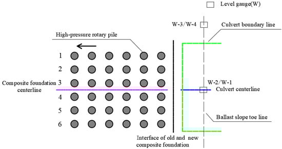 Considering the selection of a composite foundation for newly-built line widening sections, the high-pressure rotary jet pile can meet the requirement of low clearance for construction machinery, and has a simple technology and a short construction period. Therefore, a high-pressure rotary pile composite foundation was selected as the foundation treatment shape to achieve foundation reinforcement in this work [,]. Combined with the high-pressure jet grouting test results, the grouting pressure was determined as 25 MPa, and the lifting speed was about 0.2 m/min. The pressure around the pile was calculated as 220 kPa according to the empirical formula of blast pressure attenuation proposed in the literature [,]. The pressure will be transferred to the existing subgrade transition section and culvert through the lower composite foundation, resulting in deformation and affecting the operation quality of the train. Therefore, real-time monitoring is needed to reasonably control the existing structural deformation.