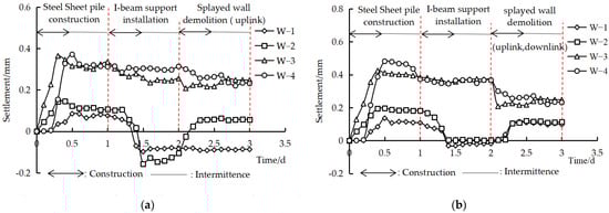 The relation curve of level gauge deformation with the implementation time of the protection scheme at each site is shown in Figure 9. The demolition of the existing downlink splayed wall at Site 1. follows the completion of the uplink culvert extension structure construction. The analysis shows that the level gauge deformation increases with the implementation time during the construction of steel sheet piles on the uplink and downlink. The deformation of the level gauge decreases when the I-beam support is installed, among which the deformation of the level gauge on the upper side of the culvert is 0.139–0.264 mm, while the deformation of the level gauge in the transition section is smaller (<0.1 mm). When the existing splayed wall is chiseled, the deformation of the level gauge on this side has a greater impact, the deformation of the level gauge on the upper side of the culvert tends to decrease, and the level gauge at the transition section tends to increase. For Sites 1 and 2, the deformation amplitude of the level gauges W1–W4 all appear in the steel sheet pile construction stage. These are 0.085, 0.145, 0.364, 0.371, 0.136, 0.197, 0.424, and 0.481 mm, respectively, illustrating that the implementation of the slight disturbance protection scheme has little influence on the existing line.
