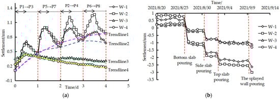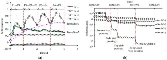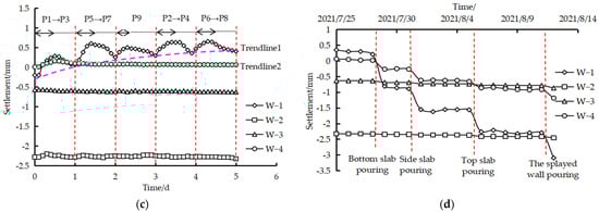 The relation curve of level gauge deformation with the construction time of each stage at Site 2 is shown in Figure 11. The analysis shows that the deformation of level gauges W-1 and W-2 on the upper side of the culvert fluctuates with the construction of the composite foundation and shows an overall upward trend until the completion of the composite foundation. The deformation values are 0.676 and 0.877 mm, respectively. The deformation of level gauges W-3 and W-4 increases first and then decreases in the transition section position with the construction of the composite foundation. At the late stage of composite foundation construction, due to the material accumulation in the transition section near the downlink side, the deformation values of the level gauge on the downlink side are lower than those on the uplink side for the upper side of the culvert and the transition section. When the culvert extension structure is constructed, the deformation values of W-1 to W-4 decrease abruptly under the pouring stage of the bottom slab, side slab, top slab, and splayed wall. Until the culvert extension structure is completed, the deformation values of W-1 to W-4 are −2.636, −3.009, −1.109, and −1.310 mm, respectively, and the deformation values of W-1 and W-2 are significantly higher than those of W-3 and W-4. The maximum difference values of the upper side of the culvert and the transition section position are 0.373 and 0.201 mm, respectively. Combined with Figure 9, the analysis shows that lateral symmetrical construction can significantly reduce the influence of the difference in deformation values between the upper side of the culvert and the transition section position on the horizontal values of the existing track for culvert extension section construction.