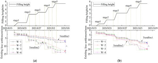 Figure 13 shows the relation curve of the level gauge settlement–filling time for Sites 1 and 2, illustrating that the level gauge settlement at each site has a nonlinear increasing phenomenon with increasing filling height. The settlement variation at each filling stage in the transition section is higher than that at the upper side of the culvert, and the settlement difference between the upper side of the culvert and the transition section decreases first and then increases gradually. The maximum settlement differences of Sites 1 and 2 are 6.436 and 6.954 mm, respectively. Since the center position of the uplink and downlink lines is about 2.7 m from the foot of the ballast slope, the actual longitudinal level values of the uplink and downlink railways of Sites 1 and 2 are 0.8 mm/(10 m), 1.1 mm/(10 m), 1.1 mm/(10 m), and 1.2 mm/(10 m) respectively, which are lower than the control value (3 mm/(10 m)). For Site 1, the settlement values from W-1 to W-4 are 7.584, 6.349, 12.635, and 14.020 mm, respectively, until the completion of the transition section filling. For Site 2, the settlement values from W-1 to W-4 are 12.583, 14.125, 20.528, and 19.547 mm, respectively, all of these values meet the requirements of the post-construction settlement value (≤5 cm).