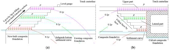 The reasons for the above phenomenon are analyzed in this section. Assuming that each layer is a uniformly distributed load (shown in Figure 14), the influence scope of the transition section of the new line on the existing subgrade increases non-linearly with the filling height as it fills up layer by layer and the longitudinal length of the transition section increases gradually with the height. The influence of the transition section filling layer on the culvert structure can be divided into the lateral area and the upper area. For the lateral area, it affects the culvert structure through the lateral wall of the culvert and the lower composite foundation. For the upper area, its vertical stress on the culvert structure is related to the ratio of the filling height and the culvert width []. The influence range also gradually increases as the transverse width of the newly-built subgrade increases. This then creates the phenomenon in which the influence of the filling of the transition section of the downlink side of Site 1 is greater than that of the uplink side.