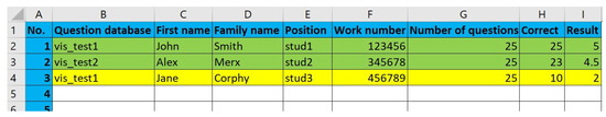 - It is followed by automatic saving of the test results—depending on the selected option—to an archiving spreadsheet file (example in Figure 19) or a text file. Depending on the initial settings, this can be a separate file for each trainee or a collective, common file for a certain group.
