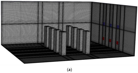 The standard k-ε, RNG k-ε, and SST k-ω models perform well in predicting the distributions of air velocity and temperature, according to previous studies [42]. The standard k-ε and RNG k-ε models used the standard wall function. The SST k-ω model solved throughout the near-wall flows [43]. In this study, the prediction accuracies of the three turbulence models were compared, and the model with the highest accuracy was used for the next simulation calculation. The discrete ordinate (DO) model was used to calculate the heat transfer between different wall surfaces (walls, windows, human body surfaces, and lamps). The Boussinesq model was used to consider the buoyancy effect [44]. A second-order upwind scheme was used to discretize the momentum, energy, and turbulence equations. SIMPLE was used as the pressure–velocity coupling method. The energy-scaled residuals and radiation intensity residuals were set to 1 × 10−6, and the other scale residuals were set to 1 × 10−4.
