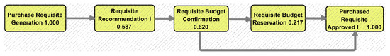 - Variant 2: In this variant, there are 98 cases, and each consists of 5 activities. This variant covers 1.4% of the log data and the sequence of activities according to their event IDs; this variant contains purchase requisite generation → requisite recommendation I → requisite budget confirmation → requisite budget reservation → purchase requisite approved I (2 → 3 → 4 → 4 → 5). Table 11 represents these 2 most frequent sequences of our log.