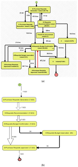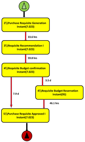 These Petri nets now fully explained the process flow in optimized form. After the control flow analysis, the performance analysis was carried out to find the issues related to the time stamp in order for us to analyze the things that still had an impact on the process flow. Figure 9 shows the performance map of the procurement process in Disco, and from it, we recognize the activity path that consumes the maximum time and affects the performance. In the Disco tool, several options related to time are shown in Table 12. In this table, the first column shows the activity paths across which time is measured, and in this column, ‘C’ represents the activity ‘requisite budget confirmation’, and ‘R’ represents the ‘requisite budget reservation’. Here, the total duration shows the highly impacted areas for delays in our process by giving the cumulative times (time taken by adding up the overall cases) for each path between activities. Alternatively, the mean duration gives the average time spent between activities. The maximum duration measures the most considerable execution time and delays in flow, and the minimum duration gives the minimum execution time taken between activities. These measures show that the maximum time consumption and delay are in the path ‘requisite budget confirmation purchase requisite approved I’.