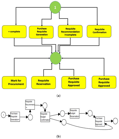 The alpha algorithm [39] aims at reconstructing causality from a set of sequences of events. It constructs Petri nets with unique properties (workflow nets) from event logs, and each transition of a Petri net corresponds to observed tasks. Figure 6a illustrates how complex the model is to understand the actual flow of the process. It represents the total of 789 variants or sequences in which many sequences have the repetition of activities in a single sequence (as in the sequence 2 → 1 → 2 → 3→ 2 → 3 → 4 → 5 → 4 → 5). Furthermore, there are many incomplete traces (such as 2 → 3 → 4 → 6), less frequent traces(e.g., the sequence 2 → 3 → 4 → 7 occurs only one time in the whole data), some unnamed activities (such as activity 6 and some activities with ID 4 that have no activity name), and generalizability issues related to activities (e.g., the presence of two activities across the same event ID 5, and the fact that the activity ‘purchase requisite generation’ has two IDs, 1 and 2). Three discovery algorithms were also applied to these data to generate mined models.