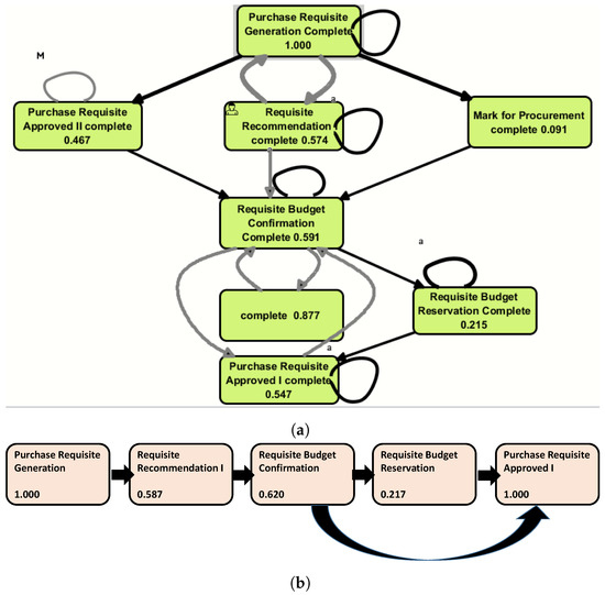Figure 7a illustrates that the generated Petri net did not reflect the correct flow because of the limitations of the alpha algorithm. In addition to the general issue of log completeness, it cannot produce the correct model. It produces very complex models, and the frequencies are not considered in this algorithm; therefore, it is susceptible to noise and can easily misclassify a relation. As our data were extensive, it did not give reliable results.