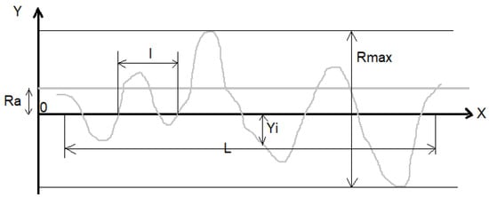 The surface roughness (SR) is expressed as a value in a mean arithmetical deviation Ra (Equation (1)) of the profile from the centerline average and Rmax (also called Rt or Rtotal), which is the height from the lowest point to the highest peak. It is expressed mathematically as follows: