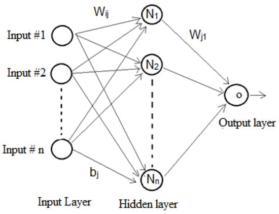 ANN is a computing system composed of a collection of connected nodes emulating neurons in the human brain and capable of solving problems such as function approximation, classification, and time-series prediction. The ANN approach has lately gained researchers’ interest in addressing and modeling complicated issues and dealing with nonlinearity between parameters in various fields. It is a multilayer network in which every neuron in one layer is fully linked to every neuron in the layer above it. Figure 2 depicts a typical ANN arrangement.