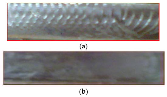 (a): Aluminum blocks—machine configuration 11: Ra = 1.16 µm (speed 2000 rpm, feed 500 mm/min, radial depth 1.5 mm, and axial depth 20 mm); (b) machine configuration 13: Ra = 0.5 µm (speed 2000 rpm, feed 100 mm/ min, radial depth 1.5 mm, and axial depth 20 mm).