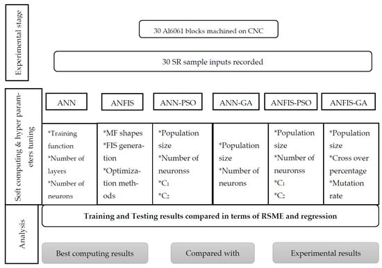 Six algorithm models, ANN, ANFIS, ANN-PSO, ANN-GA, ANFIS-PSO, and ANFIS-GA, have been employed to predict the surface roughness of blocks of aluminum Al6061 machined on a CNC milling machine. Specific parameters, namely the spindle speed of rotation, the feed rate, and the axial and the radial depth of cut, have been used as data inputs to train the models, while the target output was the surface roughness of the machined aluminum. Parametric analysis has been performed to analyze how the hyperparameters of each model affect the prediction performance. This study reveals that an adjustment of the configuration of the models alters their robustness. Though most models exhibit a relatively higher memorization capability, as suggested by the values of the training regression, the ANN models would potentially yield the best results, based on the testing regression value. The study has shown that the effectiveness of the model being trained is heavily influenced by the hyperparameters. It highlights the impact on the quality of the model being trained. These parameters are responsible for regulating the behavior of the model and have a direct impact on its performance. The study has demonstrated that the correct selection of hyperparameters can significantly improve the overall accuracy and efficiency of the model. Thus, it is crucial for researchers and data scientists to carefully consider the hyperparameters during the training processes of models to ensure the best possible results. This study demonstrates that although soft computing techniques could potentially enhance the Al6061’s surface roughness, the robustness of the models is closely related to their hyperparameters, which cannot be estimated a priori in many practical cases. The results reported in this study show that data could be used to build robust machine learning models. The robustness of these models could be enhanced through the optimization of the hyperparameters affecting their prediction performance. To strengthen the present study, our next goal is to use the predicted data results in a randomized manner during an experiment on the CNC milling machine. By doing so, we can draw a comparison between the results obtained from the predicted data and the actual experiment, which will enable us to validate the efficacy of our model. This step is crucial in ensuring that the predictions made by our model are accurate and can be relied upon for future experiments. It is our constant endeavor to improve the accuracy of our models and ensure that the results obtained are reliable and trustworthy. Through this exercise, a deeper understanding of the CNC milling machine and its behavior can be gained, which will contribute to the advancement of the manufacturing engineering field.