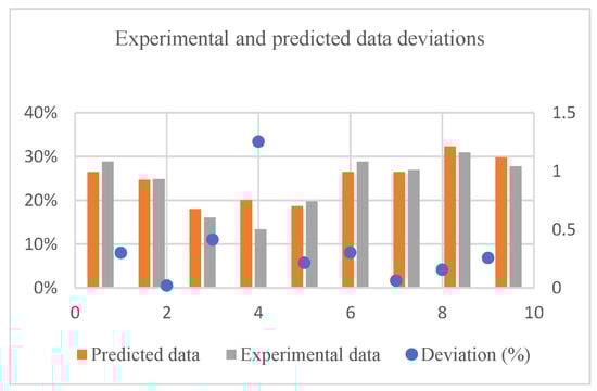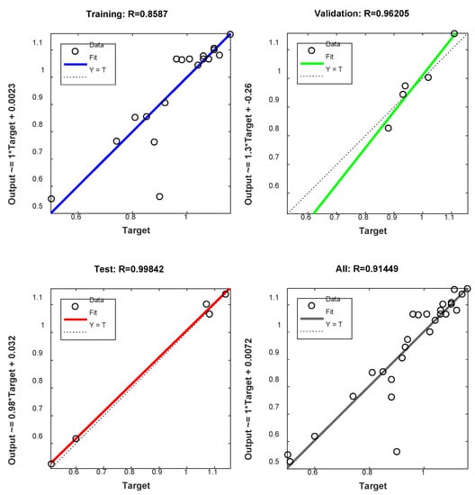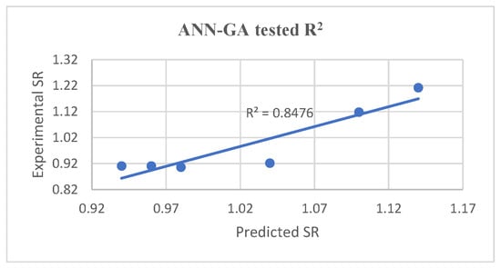 The ANN-GA hybrid model using the size of the population of 75 and number of neurons of 5 yielded better results (RMSE of 0.124 R2 of 0.514 for training and 0.8475 for testing). Figure 14 and Figure 15 show the regression lines of the training and testing models. Experimental data are plotted against predicted data, both expressed in terms of mean arithmetical deviation Ra (µm).