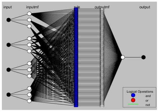 The adaptive network-based fuzzy inference system (ANFIS) is a neural network based on the Takagi–Sugeno fuzzy inference system. It offers the possibility to harness the benefits of pairing neural networks and fuzzy logic principles in a single structure, since it incorporates both. Its inference system comprises a collection of fuzzy IF-THEN rules with the capacity to approximate nonlinear equations through learning and forecasting disordered time series. Various types of fuzzy inference systems have been identified in the literature. They may be divided into three types, described in detail by Jang [19]. Figure 3 depicts a two-input type 3 fuzzy inference system construction with five layers separated. Input variables are represented by x and y; layer 1 has square nodes, which are labeled A for input x and B for input y; layer 2 has circled nodes, which are labeled Π; layer 3 has circled nodes, which are labeled N; layer 4 has square nodes, which are labeled 1–9; and layer 5, the sum of all incoming signals, has a circled node that is labeled Σ.