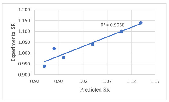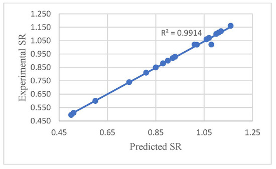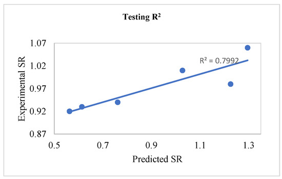 It emerged that the ANN-PSO model configuration having a population size of 200, several neurons of 9, and acceleration values c1 = 1.5 and c2 = 2.25 yielded a better RMSE of 0.02098, R2 of 0.9938 for training, and R2 of 0.7992 for testing. Figure 12 and Figure 13 show the model’s trained and tested regression lines, where the targets are plotted against the outputs, with both the experimental and predicted mean arithmetical deviation Ra (µm).