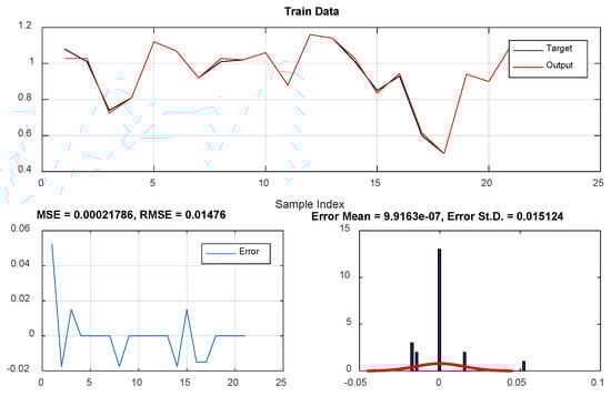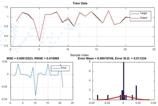 It emerged that the ANFIS-GA hybrid model trained using the size of population POP = 25, the mutation rate Mu = 0.2, and the cross-over percentage 0.4 generated a better RMSE of 0.01097 and the regression values R2 of 0.9939 for training and 0.8102 for testing. In Figure 19, the prediction error and the training behavior of the ANFIS-GA training model are plotted against the sample number.