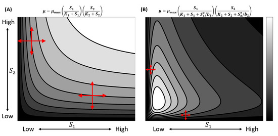 Two examples of colimitation with LLM as a special case. and are two resources that co-limit the growth of the organism. Light colors indicate higher growth and darker colors indicate lower growth. Instances of LLM are denoted by the red arrows. (A) No adverse effect and growth become infinite at infinite resources. (B) The inhibitory effect is incorporated at low and high resources. The maximal growth exists in case B, but not in A. These functional forms and additional ones have been studied previously [5,7,8].