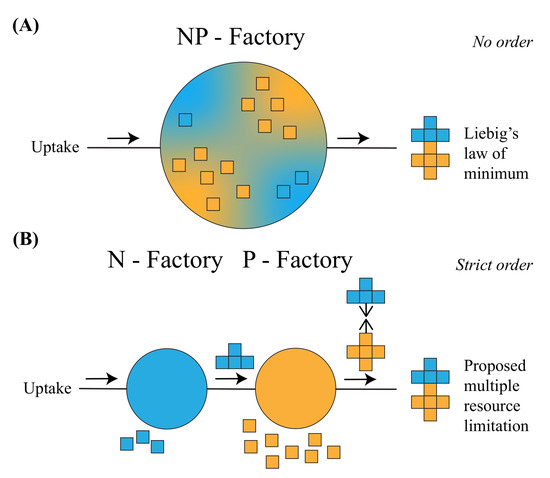 An analogy for Liebig’s law of the minimum and the proposed multiple resource limitation. (A) An NP-factory that concurrently processes both N and P to make the final product as an analogy to Liebig’s law of the minimum. The production rate of the final product is constrained by the slowest rate of making sub-parts from N or P. (B) Two resource-specific ones (N-factory and P-factory) in a strict production chain as an analogy to the proposed multiple resource limitation. The time to make a final product is then the combined time to make N- and P-sub-parts. Note that there is no order of production in A, but a strict order of production in B.