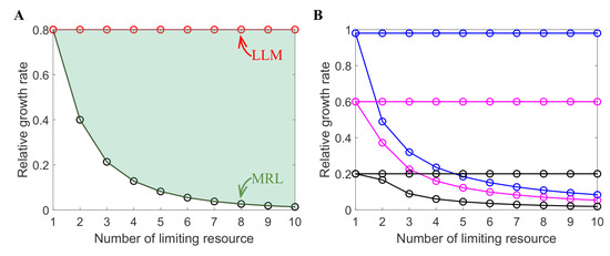 Comparison of Liebig’s growth law and the MRL growth based on the Droop cell quota model. (A) Red dots are Liebig’s growth, and green dots are MRL growth. Increasing the number of limiting resources decreases the growth rate in the MRL growth, but has no effect on the growth rate under Liebig’s growth. The green shaded region should contain the true growth. In this case, all resources were assumed to have the same limiting effect. (B) Effect of one resource being the most dominant limitation. Blue, magenta, and black represent the scenarios where one resource is slightly, moderately, and significantly more limited than all other resources, respectively. As a resource becomes more limiting, the distance between the two growth formulations decreases. However, this effect quickly saturates as more than three resources are considered. In this case, except for the most limiting resource, all other resources were assumed to be equally limiting.