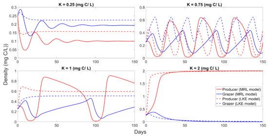 Loladze and colleagues demonstrated that the LKE model contains “a paradox of energy enrichment”, where energy enrichment (increasing the light-limited carrying capacity K) decreases the grazer density (and, indeed, can cause grazer extinction) by lowering food quality, an important contribution to the theory of predator–prey by highlighting the impacts of food quality. Later models built on the same framework also show similar qualitative properties, which led to the impression that the paradox of energy is unique to the threshold (minimum) formulations in the LKE model [12,22]. Here we show that the MRL model, with its distinct formulation without minimum terms, retains this key feature of the LKE model. Specifically, increasing K results in the deterministic extinction of the grazer in the MRL model, see Figure 4. Furthermore, as expected from the model formulation, the MRL model gives a lower bound on the growth dynamics. For example, when mg C/L, the MRL model shows transient oscillations that persist for some time before dampening toward a steady-state with lower values than those seen in the LKE model. When mg C/L, the MRL model also shows a clear distinction in the speed of convergence to the steady-state value. For moderate K, the MRL model shows periodic solutions that are typical of predator–prey models [19,34,35,36]. However, the periodic behaviors in the MRL model seem to act on a slower time scale, creating long phases of slow increase/decrease in the density of the producer and grazer as compared to the LKE model. For example, when , the oscillation period of the grazer population is about 40 days in the MRL model vs. 20 days in the LKE model. The simulation results in Figure 4 suggest that, due to slower growth dynamics, the MRL model is more susceptible to oscillations, including transient ones, compared to the LKE model. This hints at the possibility that the MRL model may be suitable for the study of periodic behaviors on long time-scales, and thus is relevant for certain biological systems, such as snowshoe hares [37].