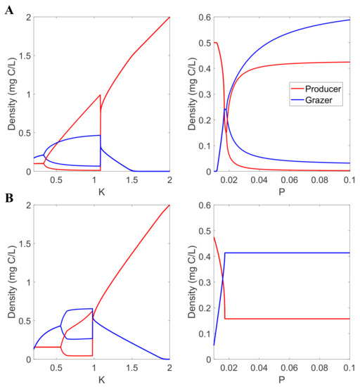 Next, we turn our attention to the effect of resource limitation on model dynamics. Figure 5 shows the asymptotic behaviors of the MRL (A) and LKE (B) models with respect to resource limitation parameters K and P. The bifurcation plot confirms the paradox of energy enrichment observed in Figure 4. Furthermore, Elser et al. (2012) and Peace et al. (2013) discussed and formulated models to study a phenomenon known as the “stoichiometric knife-edge” in which excess food resource content (in addition to low food resource content) can lead to the collapse of the grazer population [11,12,22]. In previous studies, the stoichiometric knife edge effect was incorporated by capping the ingestion rate of phosphorus per each unit of the grazer’s biomass per time. Here, we propose to incorporate a mechanism for this observation via a trade-off in energy conversion efficiency using the function . While the MRL model does not result in a deterministic extinction as P increases, the grazer population at high P oscillates dangerously close to 0, which increases the probability of a stochastic extinction event.