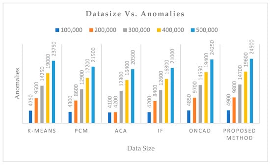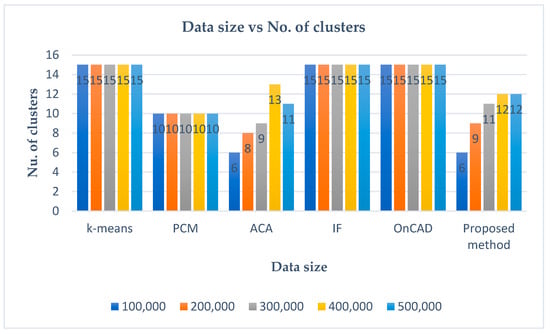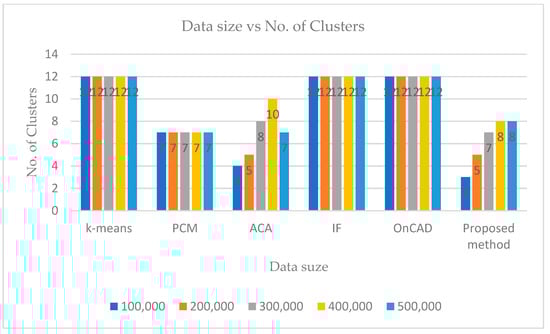 The experiments were conducted using MATLAB on an Intel Core i7-2600 machine with 3.4 GHz, 8 M Cache, 8 GB RAM, 500 GB Hard disc running Windows 10. Using KDDCUP’99 [], a stream of datasets of different sizes with fixed dimension was generated, with 37 numeric, 3 categorical and 1 temporal attributes (time-stamp). The noises were kept from 0 to 5%. Similarly, using Kitsune Network attach dataset [], another stream of datasets of different sizes was generated. The weight of each attribute was assumed to be same. The aforesaid algorithms along with the proposed one was implemented and results were recorded. The comparative analysis is presented in both tabular form and graphically in Table 2, Table 3, Table 4, Table 5 and Table 6, Figure 2, Figure 3, Figure 4, Figure 5, Figure 6 and Figure 7.