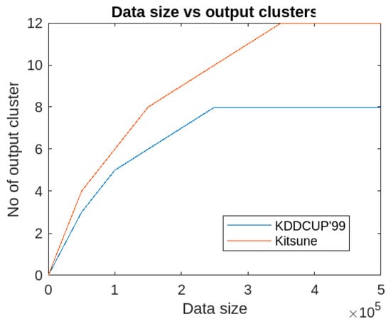 Data size vs. output clusters using KDDCUP’99 and Kitsune.