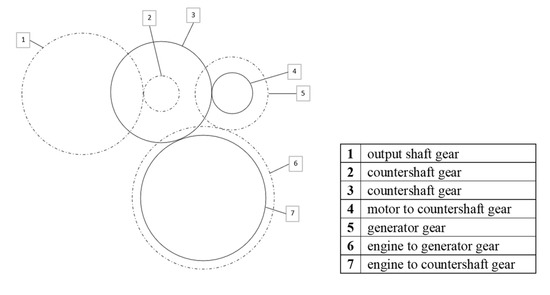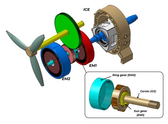A planetary gear configuration allows high torque transmission and a large speed reduction to be achieved with relatively small gears, as required by the automotive application. However, its complex design and manufacturing tend to make it a more expensive solution than other gearbox types and its configuration makes heat dissipation more difficult. Other disadvantages are the high bearing load, inaccessibility, and design complexity [20]. Moreover, it requires a complex energy management strategy. For these reasons and for the fact that it is impossible to disengage the engine in case of failure, the Honda system was adopted in this investigation and a preliminary Honda-type series/parallel hybrid configuration was designed. To the authors’ knowledge, this system has never been considered for aerospace applications.