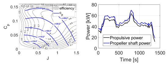 Propeller efficiency map (left) and propulsive vs. shaft power (right).