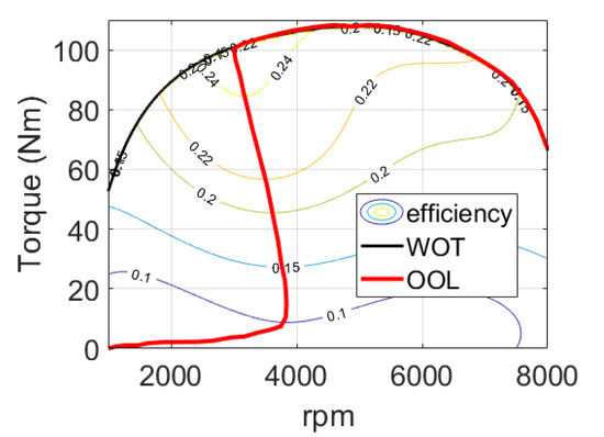 WOT torque curve (black line), efficiency map (isoline map), and OOL(red line) of the Wankel engine at sea level.