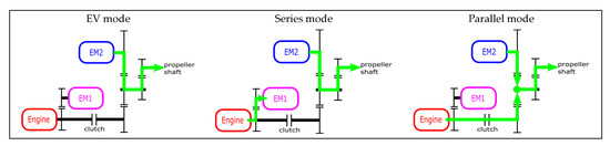 The operating modes of the HHS are schematized in Figure 6. When the clutch is open, the system works in electric vehicle mode or in series HEV, while the second electric machine propels the vehicle. When the clutch is locked, the vehicle operates in parallel mode and the engine speed is proportionate to the wheel speed.