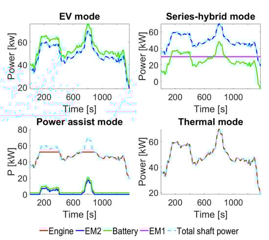 The improvement in fuel economy guaranteed by the series hybrid mode is due not only to the reduced contribution of the engine in satisfying the shaft power request, but also to the higher and constant efficiency of the engine that works always at its OOP while in power assist mode, the engine works at 4590 rpm (see Table 1). The time trends of engine efficiency in the series hybrid, power assist, and thermal cases are compared in Figure 10.