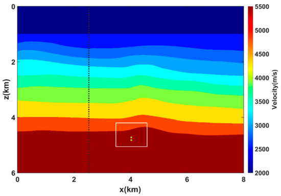 A simple model and the target zone (area enclosed by the solid white lines). VSP receivers are set along the black dotted line at 2500 m in the X direction.