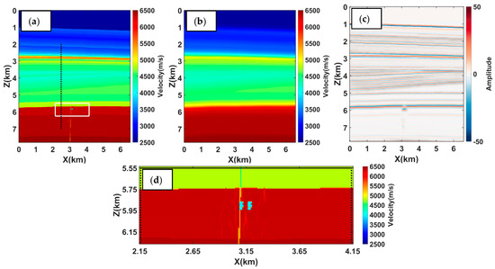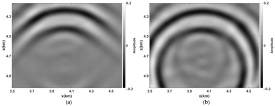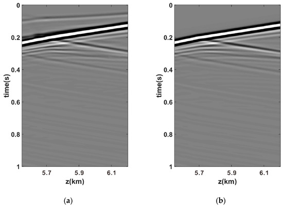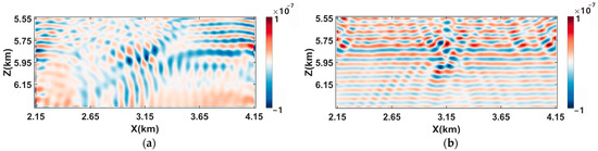 Second, we use the VSP Marchenko source-receiver redatuming to retrieve the Green’s function and its corresponding wavefield. The virtual receiver locations of this method are shown in Figure 7d, where the virtual source (VSP receiver point) is located at = (X: 2500 m, Z: 6600 m) and the virtual receiver array location at = (X: 2155 m, Z: 5555–6185 m) is shown by the left black dashed line. The wavefield of the retrieved Green’s function is shown in Figure 9a and can be compared with the wavefield signal (Figure 9b) obtained by waveform modeling with the true velocity model. Benefiting from the incorporation of VSP data, the errors between the redatumed wavefield and the full wavefield are very small. The laterally propagating waves caused by strike-slip faulting and cavities are accurately reconstructed. It should be noted that all the events before the arrival of the direct wave in redatumed signals need to be muted in further calculations. Since and are obtained in the same manner as and , we will not repeat it here.